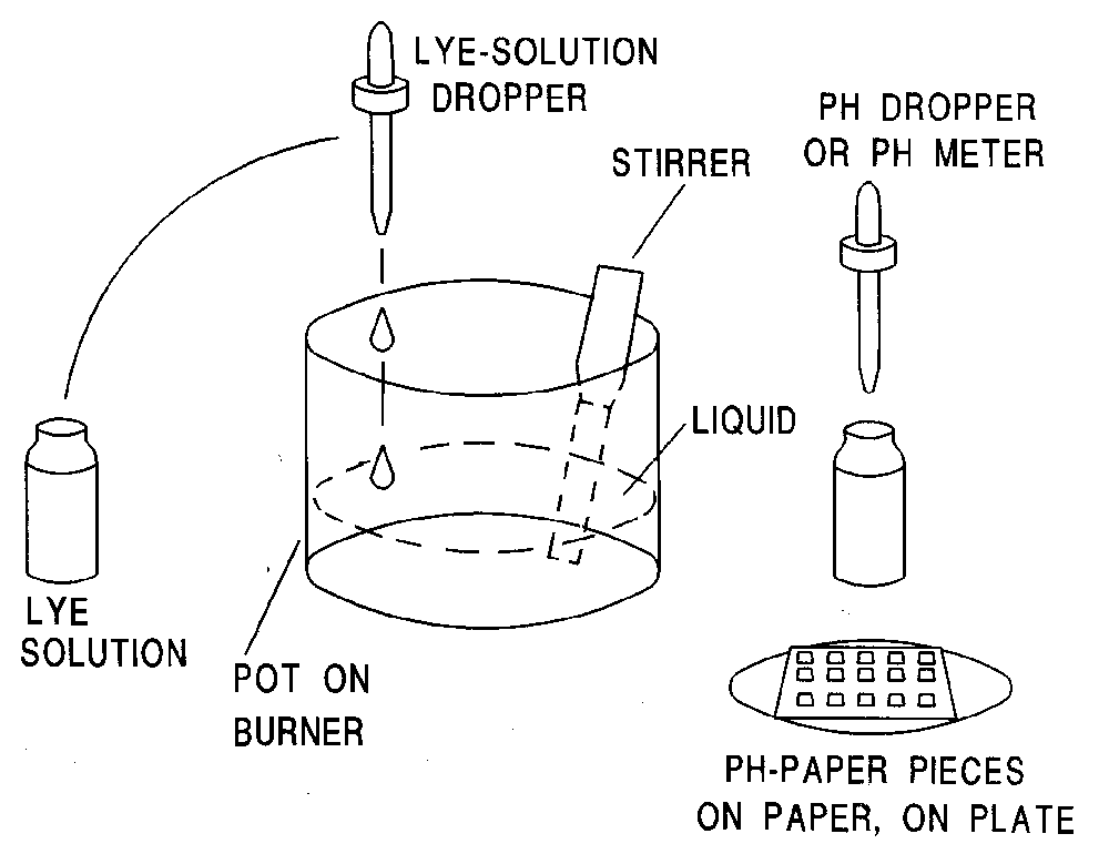 ORMUS chemische Herstellungsmethoden - Seite 2[Seite 1] [Seite 2] [Seite 3] [Seite 4]Vermeide auf jeden Fall Wasser, das Blei, Arsen oder andere toxische Bestandteile enthalten könnte. Beginne mit trinkbarem Wasser, mit Ausnahme des Salzgehaltes. Zur Not lasse eine Laboranalyse des Ausgangsmaterials herstellen. Das Kochen von laugenhaltigem Wasser tötet zwar Bakterien ab, kann aber toxische Metalle und Chemikalien nicht beseitigen. Halte dich genau an die obigen Anweisungen und verändere den pH-Wert nur sehr langsam. Vermeide Wasser, das in irgendeiner Form Sulfate oder Schwefelbestandteile enthält. Diese Art Wasser erzeugt so gut wie kein M-State-Material. Vermeide unter allen Umständen die Verwendung aluminiumhaltiger Behälter oder Werkzeuge. Vorgehensweise der Wet-MethodeBitte lies den Abschnitt ACHTUNG - WARNUNG, bevor du beginnstZuerst ist es notwendig, eine verdünnte Laugenlösung herzustellen. Doch zuvor etikettiere eine Flasche, die mit einer Pipette versehen ist, mit dem Label "Lauge – giftig", sodass diese Flasche nicht mit anderen verwechselt werden kann. Arbeite in einem Waschbecken, sodass verschüttete Lauge gleich weggespült werden kann. Der Prozess der Verdünnung von Lauge erzeugt Wärme, sei daher vorsichtig mit den Behältern, sie könnten heiß werden. Benutze eine Schutzbrille oder schließe deine Augen und öffne sie nur für kurze Momente, da aufsteigende Dämpfe die Augen gefährden können. Fülle die Pipettenflasche mit der vorbereiteten verdünnten Lauge. Falls du pH-Papier benutzt, reiße einen Streifen ab und teile ihn in 4 gleiche Teile auf, lege diese Teile auf ein bereitliegendes weißes Blatt Papier. Schematische Zeichnung Um die notwendige Genauigkeit zu erzielen, kallibriere das Papier bei veränderten Temperaturen und Luftfeuchtigkeit während des gesamten Tages. Besorge zu diesem Zweck Pufferlösung mit pH-Wert 4, 7 und 10. Solche Pufferlösung erhält du in jeder Apotheke. Falls du als Ausgangssubstanz trockenes Meersalz verwendest, mische ½ Tasse trockenes Meersalz mit 2 Tassen destilliertem Wasser. Dies ergibt eine Konzentration, die der von Meerwasser entspricht. Verfahre dann wie folgt: